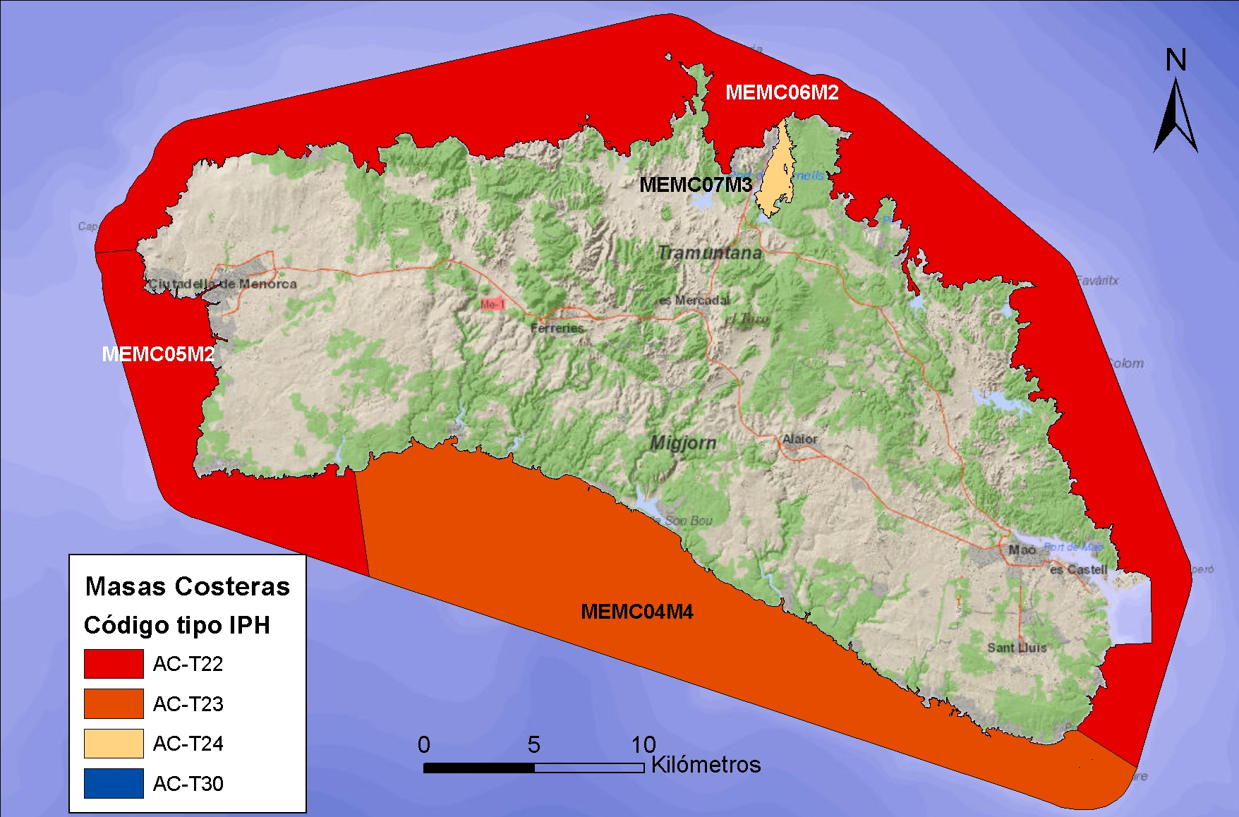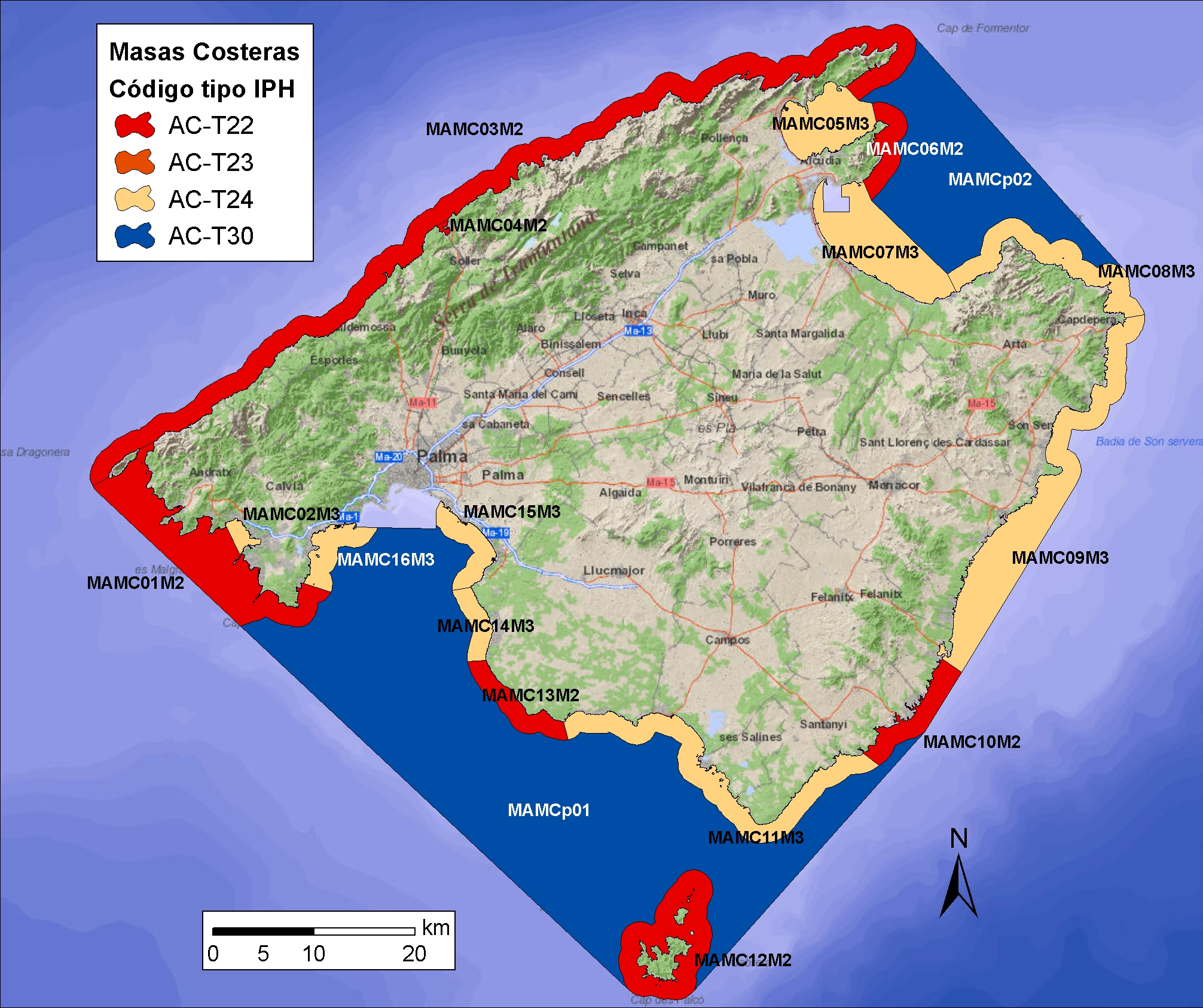 A més d’aquestes 36 masses, s’han de sumar les 5 masses d’aigua molt modificades per la presència de ports (Port de Palma, Port d’Alcúdia, Port de Maó, Port d’Eivissa, Port de la Savina), arribant així a un total de 41 masses d’aigua costanera.