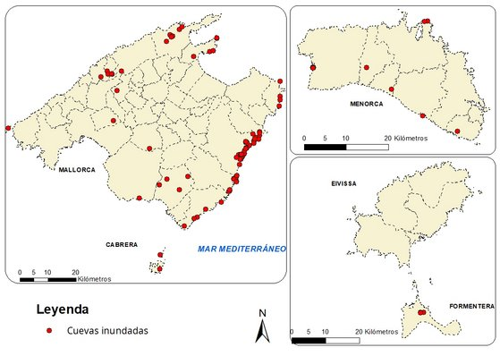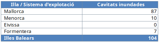 S'han inventariat un total de 104 cavitats inundades a les Illes Balears que es distribueixen de la següent manera: