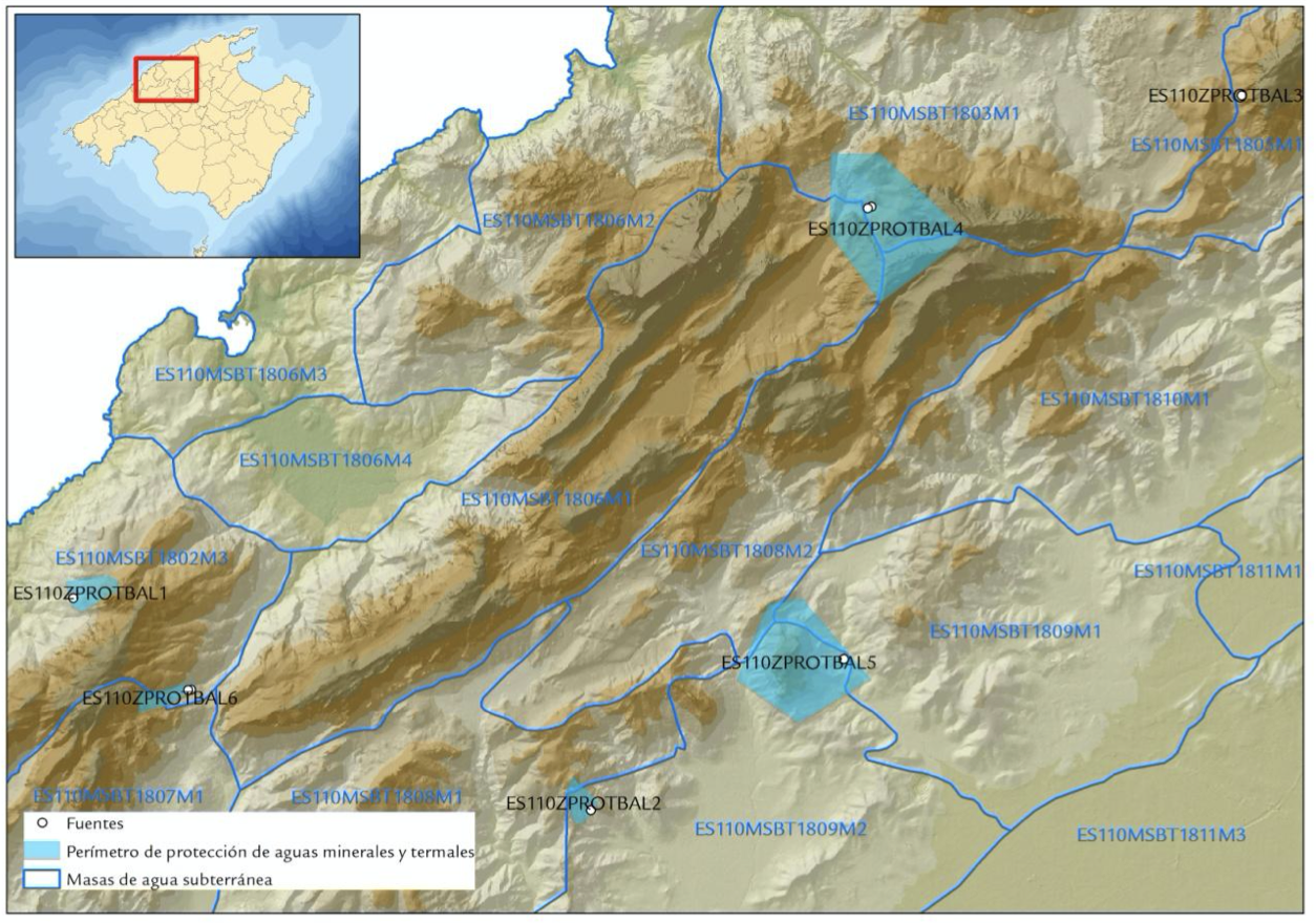 Així, a la Demarcació Hidrogràfica de les Illes Balears existeixen 6 zones de protecció d’aigües minerals. En la taula següent es relacionen amb les masses d’aigua subterrània associades: