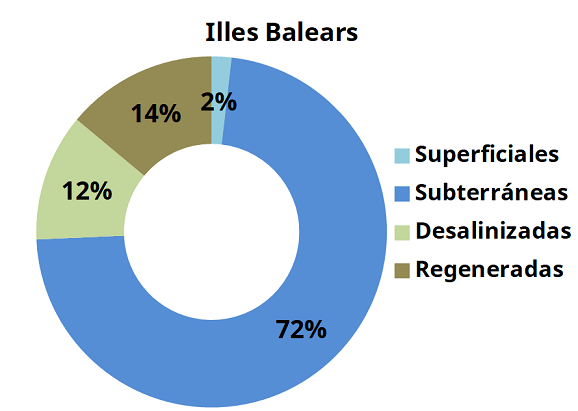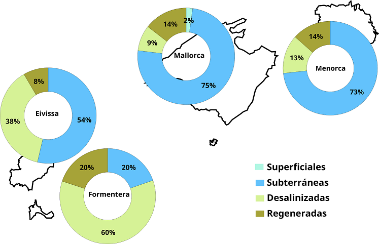 Com es pot observar tant a la taula com als gràfics següents, les aigües subterrànies són la principal font de recursos disponibles a les Illes Balears, si bé es troben diferències importants per illes quant als percentatges.
