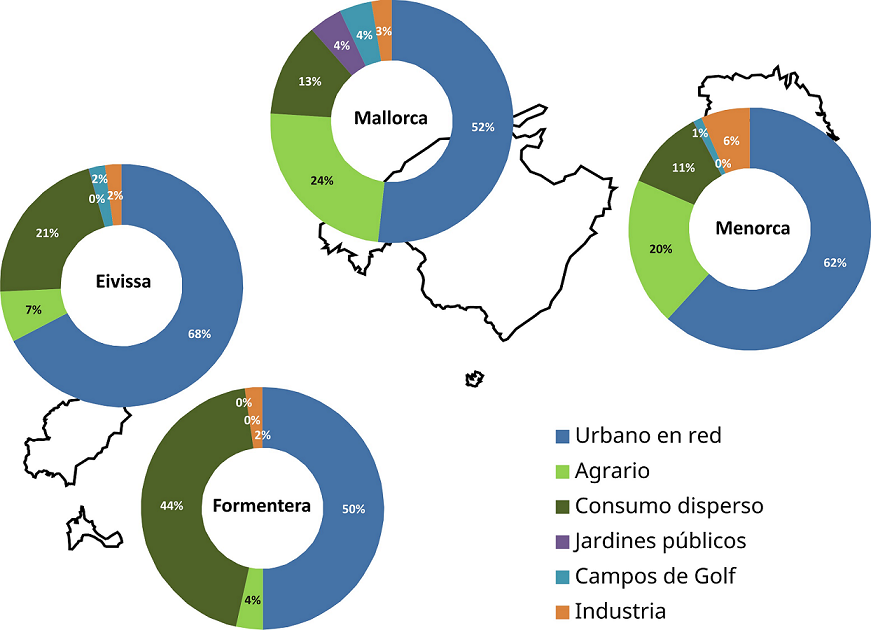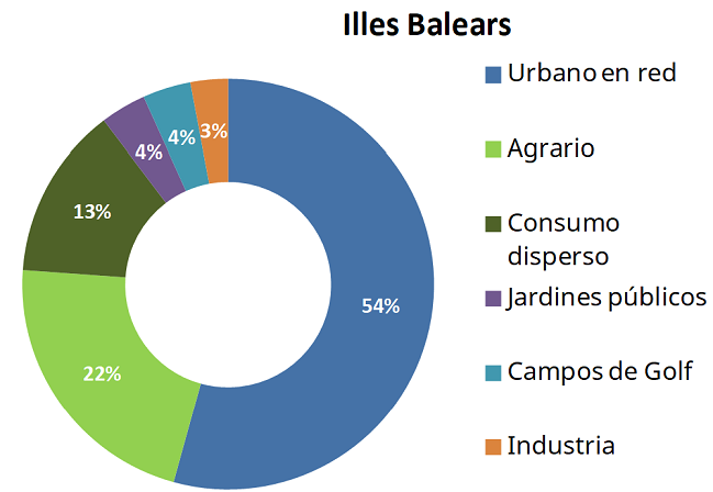 Com es pot observar a la taula anterior, l’ús principal de l’aigua és per al consum urbà, seguit del sector agrari, que representa un volum del 22% i que es destina principalment als cultius de regadiu. El volum d’aigua del que fan ús els habitatges aïllats representa un 13%. En canvi, el sector industrial de les Illes Balears és el que menys ús fa de l’aigua ja que suposa poc més d’un volum del 3%.