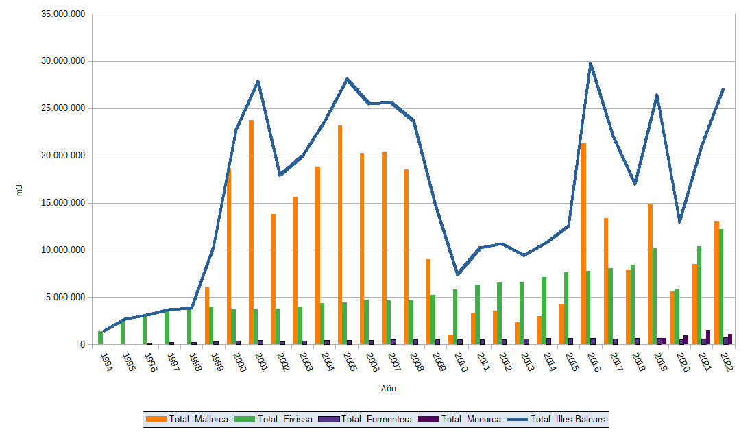 Evolució de la producció d'aigua dessalinitzada a les Illes Balears (1994-2022) (m³). Font: ABAQUA.